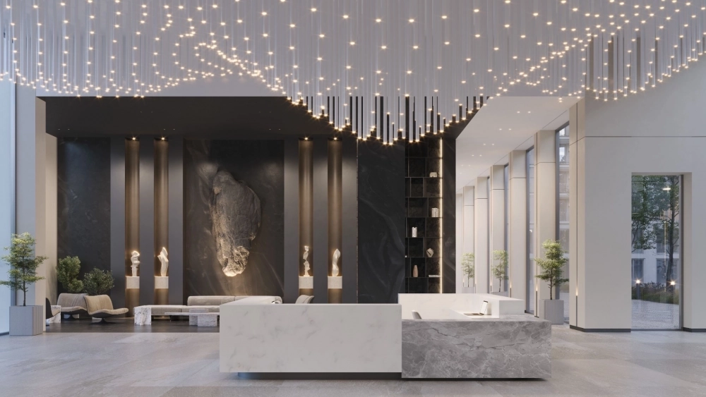 Входные группы «Начала» – это не просто холлы, а многофункциональные пространства площадью до 300 кв. м. Дизайн, выполненный с использованием натуральных материалов, живых растений, мотивов огня и камня, создает эффект погружения в иную реальность. Вертикальные камины, «звездопады» из подвесных светильников, мягкие лаунж-зоны – здесь можно комфортно провести время в ожидании гостей, устроить встречу или просто отдохнуть после рабочего дня в уютной атмосфере. В каждой входной группе – круглосуточная стойка администратора, зоны ожидания, почтовая зона.